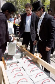 Teammates Sanusi A. Dantata '07, Aaron S. Sarfati '07, and Thomas A. Hopkin '07 load the final concrete block on the bridge that they, along with two other teammates, built as their final project for Senior Civil and Environmental Design (1.013). The bridges were required to have a span of ten feet, hold 2,000 pounds, and minimize deflection under a load.