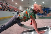 Professor Alexander H. Slocum PhD '85 does one-armed pushups in a Hawaiian shirt. Push-ups are a regular part of the annual competition.