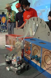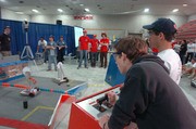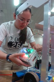 Karlen E. Ruleman '09 connects a wireless control box to her robot, "Nico," in preparation for an upcoming match. Students are given several minutes on an "on-deck" table prior to competing to ready their machines.