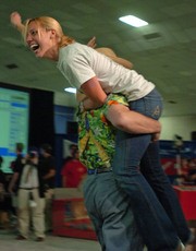 Stephanie A. Sidelko '07 is carried around the stage by Professor Alexander H. Slocum PhD '85 after winning this year's 2.007 competition. At the beginning of the semester Sidelko "just wanted a robot that would move", but she ended up placing first out of more than one hundred students.