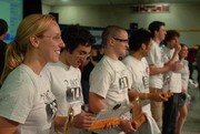 The top eight contestants in this year's 2.007 competition line up in Johnson Ice Rink. From left to right and first to eighth place, the contestants are: Stephanie A. Sidelko '07, David A. Sanchez '09, Nathaniel S. Sharpe '09, Lawrence A. Maligaya '09, Daniel E. Klenk '09 (obscured), Jeremy C. Franklin '09, Michael L. Stern '09, and Sarah E. Cooper-Davis '09.