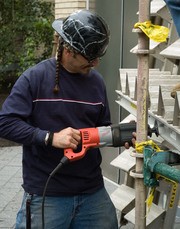 Contractor Wolf Hutchinson trims part of a temporary staircase to fit on Wednesday morning, June 6. The staircase will provide access from the Stata Center's third floor outdoor plaza to ground level while the Stata Amphitheatre is closed for renovation. Amphitheatre construction, which will begin this Monday, June 11, is scheduled to finish in early September.