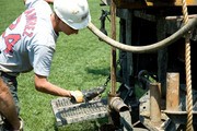 Neal Smith, a contractor from Carr-Dee Corporation, examines some sediment flushed from a monitoring well during drilling near the Stata Center. John Brancaccio, another Carr-Dee contractor, said that the 37-foot-deep well will be used to take water and soil samples in preparation for the construction of a building next to Stata.