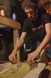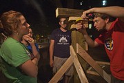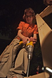 Anthony D. Rindone ’10 drills a mounting hole for the wooden astronaut trainer that residents of East Campus students made for Residence Exploration.