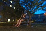 Katherine J. Rahlin ’09 is pulled up the East Campus zip-line before being released at the top. The zip-line, put up for Residence Exploration, stretched north-south on steel cables strung between the parallels.