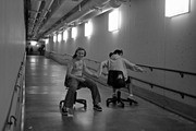 Rachel A. Bowens-Rubin ’11 (left) and another freshman ride desk chairs down an underground ramp between Buildings 66 and 68.