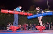 Colleen P. Mosley ’09 and Navine Nasser-Ghodsi ’09 battle it out with their foam weapons during the Residence Exploration West Side Bash on Barry Astroturf Field Sunday evening.