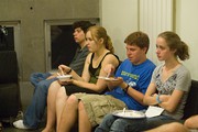 Freshmen (left to right) Matthew G. Escoto ’11, Amanda S. Fried ’11, David B. Feldman ’11, and Kristin D. Kuhn ’11 enjoy waffles and a movie at Simmons’ Waffle Haus Monday at midnight.