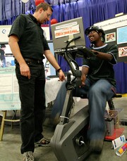 Civil and Environmental Engineering Instructor Stephen W. Rudolph shows Robert K. Brown ’11 a laptop computer powered by an exercise bike at yesterday’s Academic Expo in Johnson Ice Rink. The Expo gave freshmen a chance to meet faculty members from all of MIT’s Departments and academic programs.