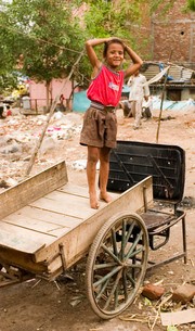 DELHI, INDIA—A child plays in a wheelbarrow in a slum just outside of Delhi. MIT students sponsored by the Public Service Center traveled to Dehli to survey humanitarian efforts by the Deepalaya Non-Governmental Organization in the area. This photo is part of a series that showcases the summer adventures of Tech staff members.