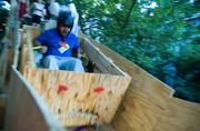 An East Campus resident holds on tight as he rides down the initial ramp of “2 Chicks at the Same Time (The Ride).” EC residents and freshmen built the log flume ride, which featured a net 17-foot vertical drop, for EC Rush this year.