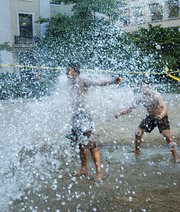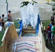 Freshman Romain A. Teil (left) and senior Sean C. Morton (right) bask in the water sprayed by a log flume ride built for EC Rush. The ride, named “2 Chicks at the Same Time (The Rid),” featured a net 17-foot vertical drop.