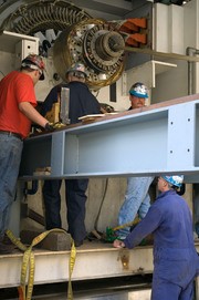 At the MIT Cogeneration Plant, Rich Hagar (bottom right) pumps a hydraulic jack piston as (top, left to right) Donny Warner, Denis Tebo, and Ricky Parker keep a close eye on the operation. The contractors inserted a 20-ton generator part this past Wednesday, Sept. 12 after it returned from repair.