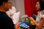 Julia Z. Yu ’10 (right) speaks with Derek Choy and Grace Ulvevadet at the eBay booth.
