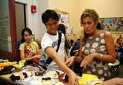 Maria Brennan, assistant director of the International Students Office, welcomes Yew Chin Leow G and his wife Kimberly Ang to the inaugural ISO Jeanty International Tea.