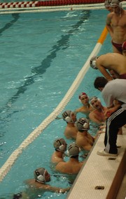 The men’s water polo team huddles together in a time out during the first period of yesterday’s game against Harvard University. The Engineers lost 8-11.