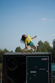 A student from the University of Vermont rocks out on top of a bike trailer during races on the University of Massachusetts-Amherst campus. The UMass cycling team hosted the races this past Saturday, Sept. 22.