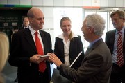 Swedish Prime Minister Fredrik Reinfeldt accepts a copy of graphic designer and computer scientist John Maeda’s book Simplicity from MIT Media Lab Director Frank Moss after Reinfeldt toured the Media Lab Tuesday, Sept. 25. Reinfeldt earlier presented Moss with a copy of Helene Schmitz’s book A Passion for Systems.