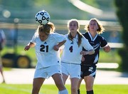 Claire M. DeRosa ’11 heads the ball while teammate Andrea E. Bradshaw ’09 and Westfield State’s Jenn Leveille look on during the women’s soccer game at Steinbrenner Stadium Tuesday afternoon. The Engineers lost 0-3, breaking the Beavers’ six-match winning streak.