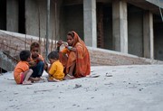 A young mother watches over her children at a construction site. The children glance longingly at the bright McDonald’s restaurant next to them as people eat behind the large, sparkling windows.
