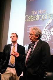 Yale Professor Charles Perrow (right) gave the Arthur Miller Lecture on Science and Ethics on “The Next Catastrophe: Reducing Our Vulnerabilities to Natural, Industrial, and Terrorist Disasters” in the Media Lab’s Bartos Theater on Monday, Oct. 22. He is the author of a book with the same title.