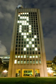 The Department of Earth, Atmospheric, and Planetary Sciences set the lights in the Green Building to display the word “SOX” on the Boston-facing side of the building in support of the Red Sox in the World Series. The Sox are up 2-0 in the series against the Colorado Rockies.