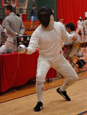Javier J. Ordonez ’10 poised with epée in hand at Saturday’s alumni fencing meet. Nearly 50 alumni attended the event to compete in foil, epée and sabre.