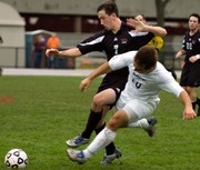 Joshua J. Campoverde ’08 slides to keep the ball from Worchester Polytechnic Institute’s Evan Demers-Peel during the final minutes of the Saturday’s match. The Engineers defeated WPI 1-0.