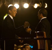 Illinois Senator and presidential candidate Barack H. Obama shakes Governor Deval L. Patrick’s hand after delivering a stump speech last Tuesday, Oct. 23.