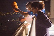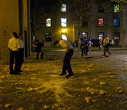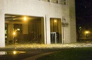 (Front to back) Asilata A. Bapat ’10, Sarang N. Kulkarni ’10, Isaac M. Asher ’10, and Eric P. Brown ’08 lob pumpkins off the roof of the Green Building last Saturday night.