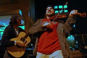 Berklee College of Music students Stash Wyslough (left) and Andy Reiner (right) celebrate the Red Sox World Series victory by jamming in the streets of Boston. See more photos on pages 10–11.