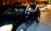 A enthusiastic driver leans out the window of his car while stopped on Bay Street Road near Kenmore Square shortly after the last game ended. The Sox defeated the Colorado Rockies 4-3 Sunday night, claiming their second World Series win in the past four seasons.