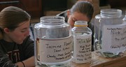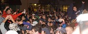 Spectators gather at the base of the Green Building to examine what happens when speeding pumpkins hit the ground.