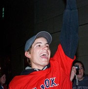 An exuberant fan celebrates near Kenmore Square. The Boston Red Sox defeated the Colorado Rockies 4-3 on Sunday night, claiming their second World Series win in the past four seasons.