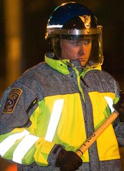 A Boston police officer stands ready to disperse rioters with a baton. The Boston Red Sox defeated the Colorado Rockies 4-3 on Sunday night, claiming their second World Series win in the past four seasons.