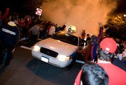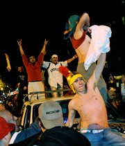 Revelers stop a passing cab and rock it until smoke pours from the tailpipe. The Boston Red Sox defeated the Colorado Rockies 4-3 on Sunday night, claiming their second World Series win in the past four seasons.