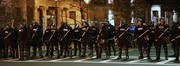 A line of police officers in riot gear blocks off Boylston Street one block west of Massachusetts Avenue in an attempt to contain the jubilant crowd that took to the streets following the Boston Red Sox victory. The Sox defeated the Colorado Rockies 4-3 on Sunday night, claiming their second World Series win in the past four seasons.