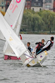 Elizabeth A. Hass ’10 and Brooks L. Reed ’09 compete for the Erwin Schell Sailing Trophy on Sunday. The team placed first in its division.