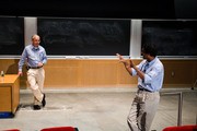Dertouzos lecture series speaker Bill Dally, also chairman of Stanford University’s Department of Computer Science, listens to a question from Course VI Professor Anant Agarwal (right) after his talk last Thursday, Oct. 31. In the talk, Dally argued that managing communication, rather than increasing raw horsepower, is the key to fast computation.