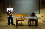 Drag Kings Bill Dagger (Mattie Richardson) and Corn Bread (Patricia Hemphill) perform in a skit about nerd-jock love at the “Too Hot to Handle” lecture and demonstration featuring their all-black drag king troupe Nappy Grooves on Oct. 31.
