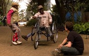 Mario A. Bollini ’09 takes a break to sit and chat with some of the community members that are testing his new module for a hand-powered tricycle in Nairobi, Kenya.