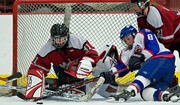 New England College’s junior forward Emily Tanguay tries to put the puck in the back of the net while MIT’s forward Lauren A. Kazmierski ’11 (right) and goalie Rachel A. Bowens-Rubin ’11 (left) defend. The women’s ice hockey team lost 10-1 on Friday evening in Johnson Ice Arena.