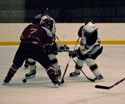 Christina M. Ottomeyer ’08 cross-checks senior Jenna Stanley of the University of Southern Maine in Saturday’s women’s ice hockey match. The Engineers were shut out in a 9-0 loss.