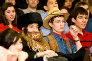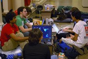 Jehan R. deFonseka ’07, David R. Harvison ’08, Michael P. Scarito ’10, Samantha M. Palazzolo ’10, Lyric P. Doshi ’08, and Esteban L. Hufstedler ’09 (left to right) camp outside 10-250 at 1:30 a.m. on the morning of Saturday, March 3 in order to get good seats for their dormitory, East Campus. They started waiting at 3 p.m. on Friday. In the background are campers from French House, already asleep.
