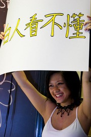 Karena K. Tyan ’08 holds up an LSC-style cue card