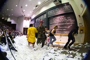 Jared C. Sadoian ’10, as a member of the “Boston Bomb Squad,” rushes fellow Chorallaries off-stage at the mention of the word “bomb” after a sketch about affirmative action’s prevalence at MIT.
