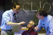 Mathematics Professor David S. Jerison, Michael Ouellette, senior lecturer in the Music and Theater Arts Department, and Jeremy M. Wolfe, senior lecturer in the Brain and Cognitive Sciences Department, of the Hamentashen team prepare a counterargument to the Latke team during the Latke vs. Hamentashen Debate. The debate attracted a large audience that filled 10-250 on Monday night. Following the debate, participants and viewers enjoyed hundreds of hamentashen and latkes in Lobby 10.