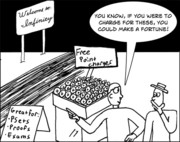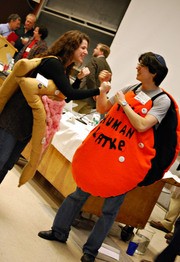 A latke mascot (Matthew S. Cons ’08) and a hamentashen mascot (Lindsey A. Pete ’08) duke it out before Wednesday’s annual Latke-Hamentashen Debate held in 26-100.