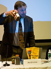 Terrascope lecturer Ari W. Epstein PhD ’95 presents different toppings that one can eat with hamentashen. The annual Latke vs. Hamentashen Debate took place this past Wednesday evening in a packed 26-100.