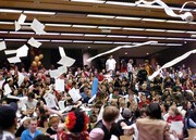 Paper — both printer and toilet — flies through the air at the start of the concert at 11:59:59 p.m. on Saturday.